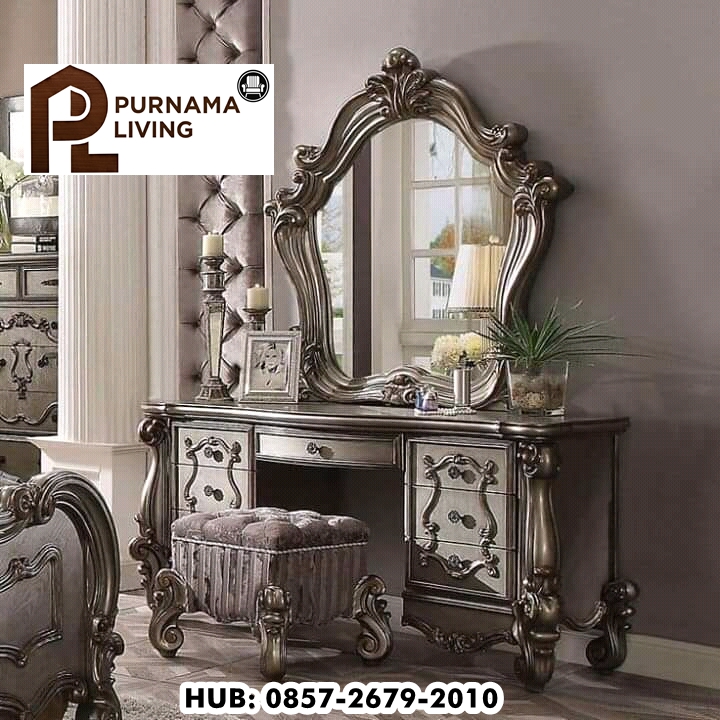 Meja rias dengan hiasan ukiran klasik yang elegan dengan pesona Classic yang dimiliki, didukung dengan finishing antik, menjadikan ruangan terlihat Classic dan mewah. Dengan cermin sangat besar menambah selera tersendiri dalam berdandan.